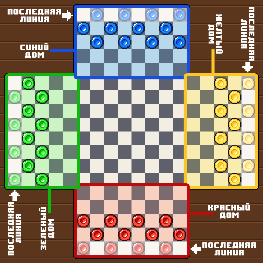 - Шашку можно поставить только на последнюю горизонталь\вертикаль своего дома при наличии там свободного места.